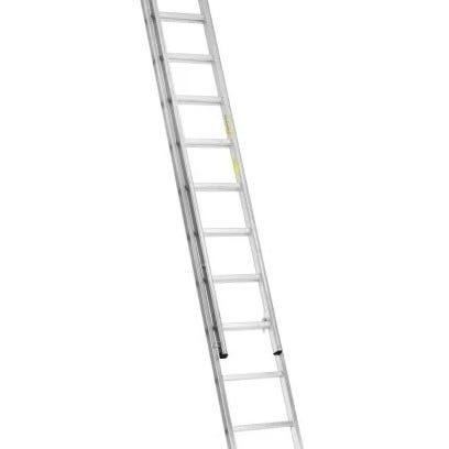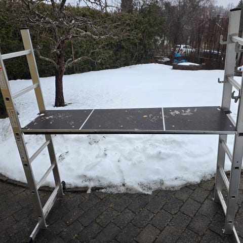 11 steg. Galvaniserad proffsstege. Praktiska hjul för lättare förflyttning. Något stag lite tillknycklat, se bild.