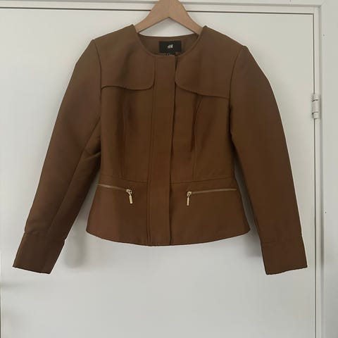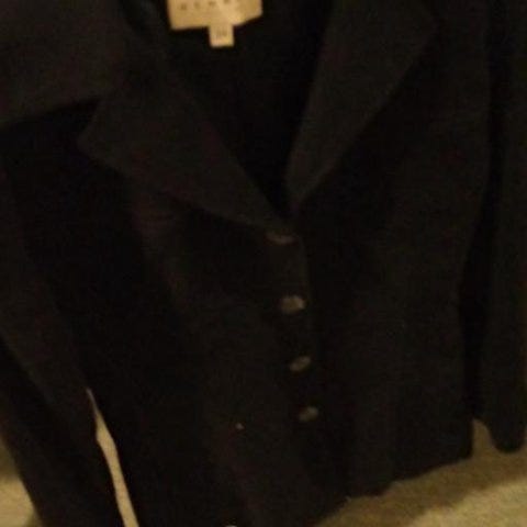 Kavaj / jacka i grå färg med diskret svarta ränder , tillverkad i ullmaterial. Jackan är avsedd för dam och har storlek S. Den har dragkedja framtill och två sidofickor.