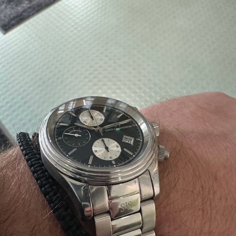 Sjöö Sandström, Royal Steel, Extreme Black, "Krons Edition", Cal SS G3 (Valjoux 7750), Serie nr 08, kronograf, herrur, 44,2mm svart DLC (Diamond Like Carbon) på stål, automatisk, safirglas, datum, glasbaksida, original gummiband, originalarmband kalv svart, ett armband krokodil ej äkta, originalspänne, cert, juni 2008, box, ytterkartong. Limiterad och numrerad (Nr. 08/30).