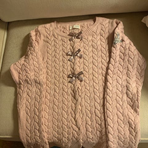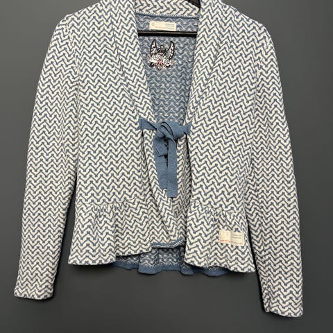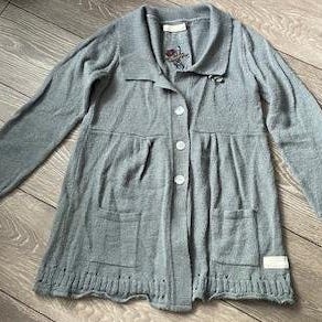 Midilång (slutar på låret) kofta, V-ringad med svart skärp. Tryckknapps-knäppning.