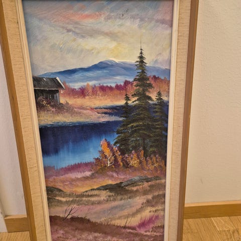Oljemålning föreställande ett landskap med ett slott eller högt berg i en ram av trä. Målningen har en mjuk färgpalett med inslag av blått, gult och vitt.