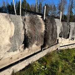 Lammskinn från får av allmogerasen Helsingefår. Fåren är ekologiskt uppfödda på liten gård i norra Ångermanland och ingår i genbank för bevarandearbete av rasen. De går fritt på naturbetesmarker längs älven under sommarhalvåret och under vintern äter de hö som skördats på gården.