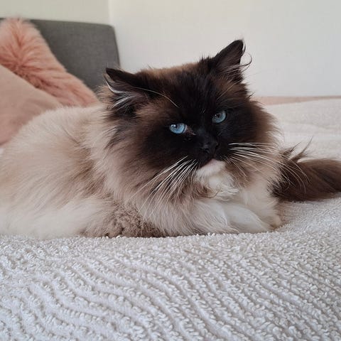 Han är en 3-årig renrasig Ragdoll (utan stamtavla) med klassiskt Ragdoll-utseende i färgen Seal Mitted på ca 5kg!