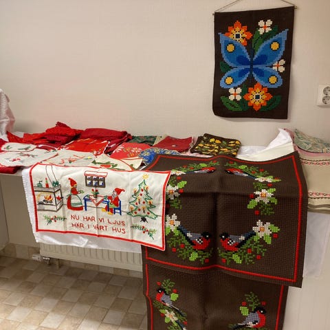 Textiler varav virkade dukar och löpare samt bordsdukar. Blandat se bild.