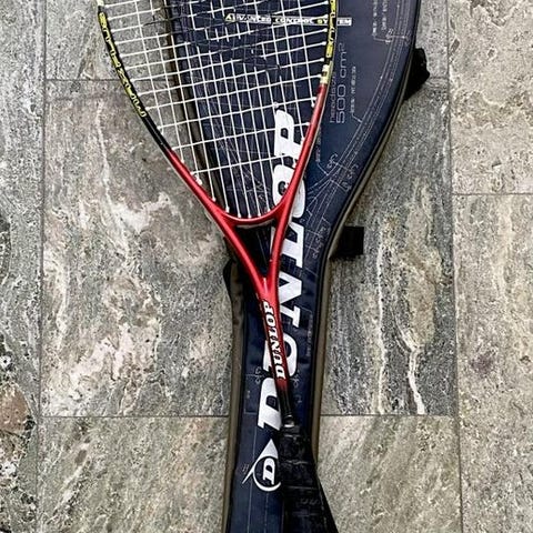Emrik Pro Graphite squashracket med tillhörande fodral. Racketen är en "oversize" modell.
