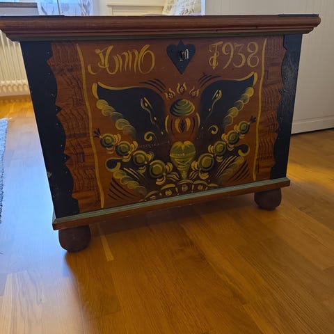 Antik träkista med metallbeslag. Kistan är gjord av trä och har två metallband som förstärker konstruktionen. Den har ett handtag i metall på framsidan för att underlätta förflyttning. Kistan kan användas för förvaring eller som dekorativ möbel.