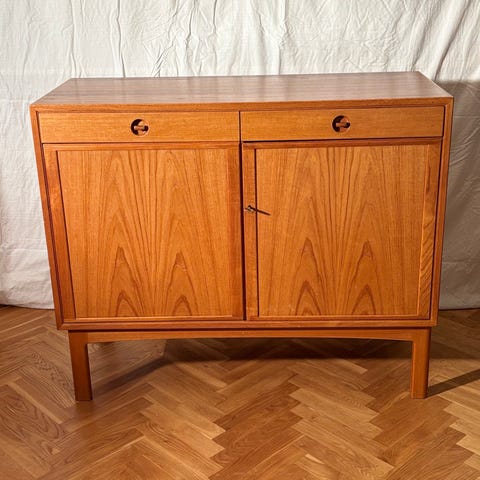 Säljer två teakskåp från sent 50-/tidigt 60-tal. Klassisk skandinavisk design med svarta ben och integrerade handtag. Båda skåpen är stabila och fungerar som de ska.