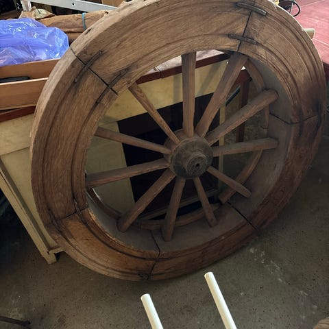 90 cm höga vagnshjul säljes efter 50 timmars renovering pga husförsäljning. Fantastiskt dekorativa. Hade tänkt göra grind av dem