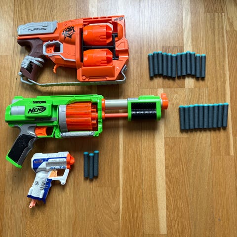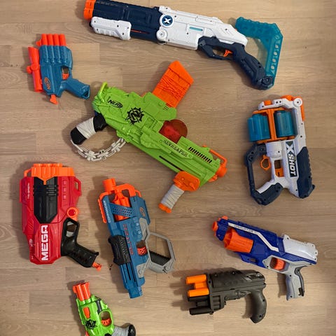 Nerf Mega och andra Nerf leksakspistoler i olika modeller och storlekar. Leksakspistolerna är tillverkade av plast och är avsedda för barn.