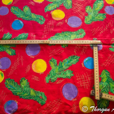 En bit bomullstyg / jultyg till pyssel pynt quilt DIY. Kuber eller paket och lite guld på röd bakgrund. Tyget är 100% bomull. Vintage tyg men nytt och oanvänt.