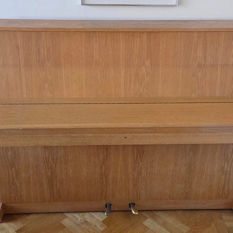 Hoffmann piano i mörkt trä med tillhörande bänk klädd i rosa sammet. Pianot har standard tangenter och är lämplig för musikövning. Ett par tangenter är ojämna och kan behöva bytas ut, de går dock att spela och öva på. Pianot behöver stämmas.