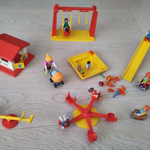 Några delar Lego Duplo från 80-talet: Bord, tre stolar, tre figurer, blommor (se bilder).
