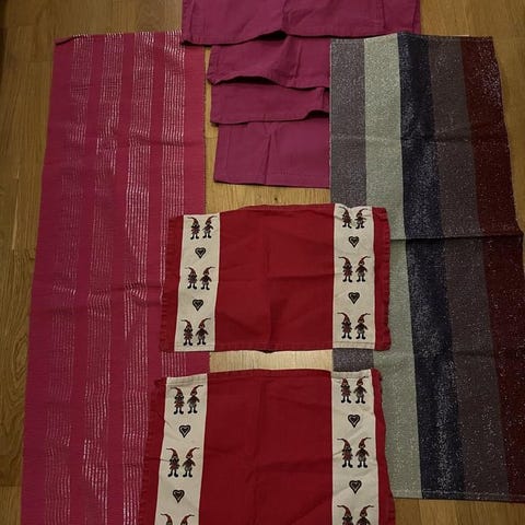 Fyra röda Bordslöpare /Dukar 1,28x0,35 att t ex lägga tvärs över bordet, som bordstabletter.