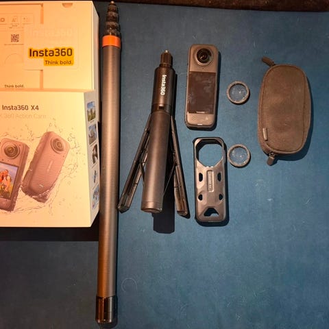 Insta360 x 4 creador kit Digital kamera med 360-graders inspelningsfunktion. Kameran är designad för att fånga panoramabilder och videor med hög upplösning, lämplig för användning i olika miljöer och aktiviteter. Följer med 2 selfiestick 1 meter och 3 meter.