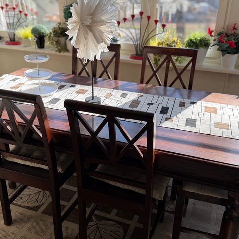 Rustikt matbord av återvunnet trä med plats för 6 personer. Bordet som är hållbart och tål år av tillställningar. Köpte det här bordet 2022 och använts sporadiskt under särbotiden. Sen 2023 har den stått i varmförråd. Det är bara bordet som finns kvar. Bordsskivan och benen kan hanteras separat.