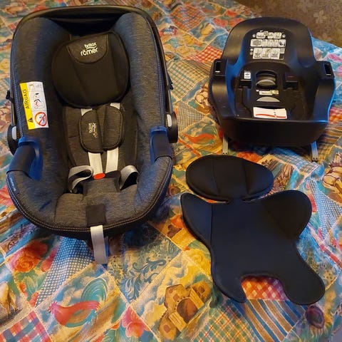 Babyskydd medföljande spädbarnsinlägg samt isofixbas.
