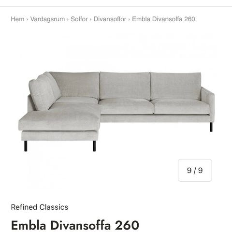 Säljer en helt ny Embla 3-sits XL från Folkhemmet i färgen Genesis Dove. Soffan är endast uppackad och ihopmonterad i vårt nya hus. Vi trodde att två soffor i samma storlek skulle fungera, men insåg rätt fort att vi behöver gå ned i storlek på ena soffan.