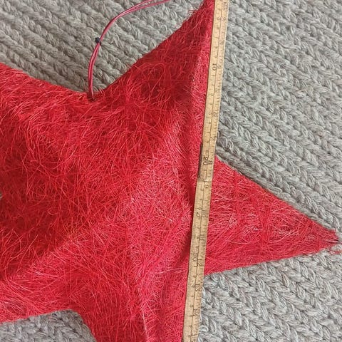 4 röda helt nya virkade stjärnor ca 19 cm i diameter med guldtråd att hänga upp dem i.