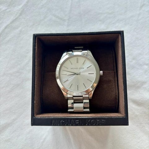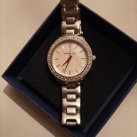 Michael Kors klocka för kvinna i metall med rund urtavla. Klockan har flera funktioner med tre små urtavlor och en kronograf. Armbandet är i metall med lås. Designen är elegant och passar för vardagligt bruk. Är i fint beg skick behöver dock nytt batteri