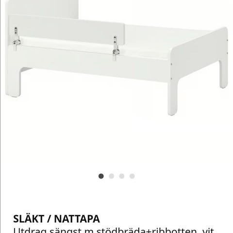 IKEA Släkt, vit sängstomme med ribbotten, 90x200 cm. Madrass Malfors (motsvarar madrass Åfjäll i dagens IKEA-sortiment). Nytvättad madrass. Några mindre skav/märken på sängstommen. Ribbotten lite knäckt på en ribba men det är inget som påverkar funktionen. Sängen är nedmonterad.