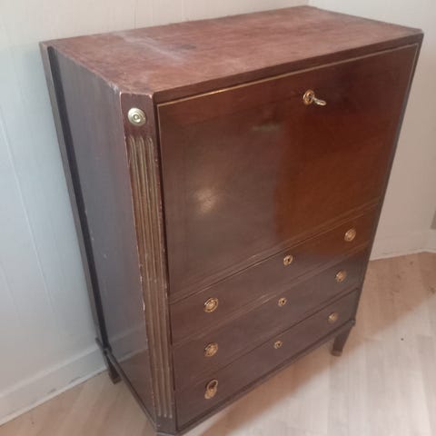 KLAFFBYRÅ, Karl Johan, 1800-talets mitt. Fanerad med mahogny.Spricka i topp. Fanerskador. nyckel saknas