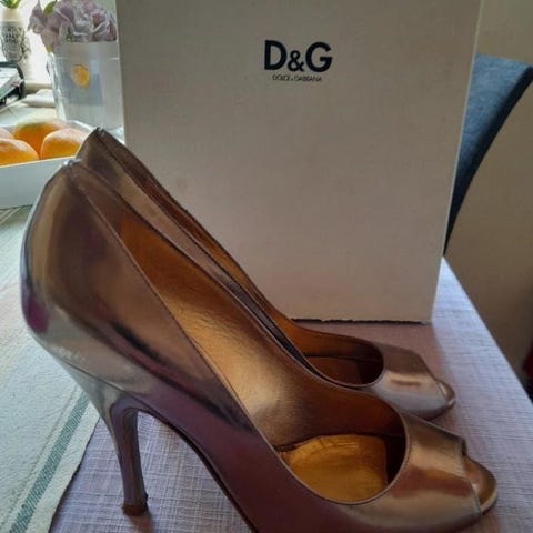 Dolce & Gabbana klackskor i storlek 38 med svart lackerat material. Skorna har en klassisk design med spetsig tå och röd insida. Passar för formella tillfällen och kan komplettera olika klädstilar. Använda ett fåtal gånger