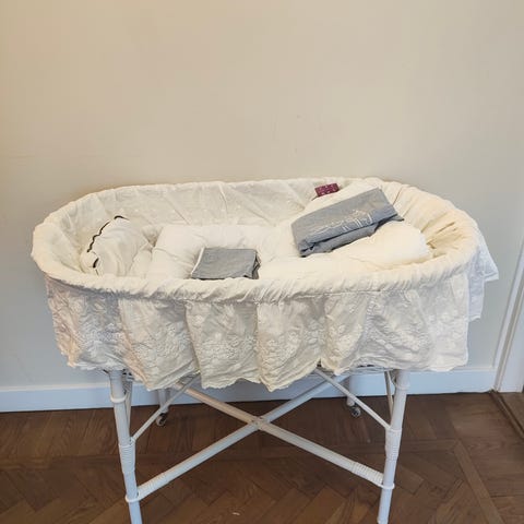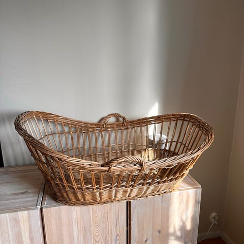 Säljer en fin retro moseskorg till bebis. Ingår en passande madrass med lakan. Passar bra att lägga babynest i, supermysig att ha bebis i i början 🌸