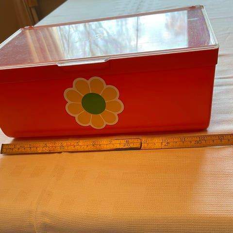 Retro orange-blommig plastburk med skruvlock, NilsJohan. Serien Sally.