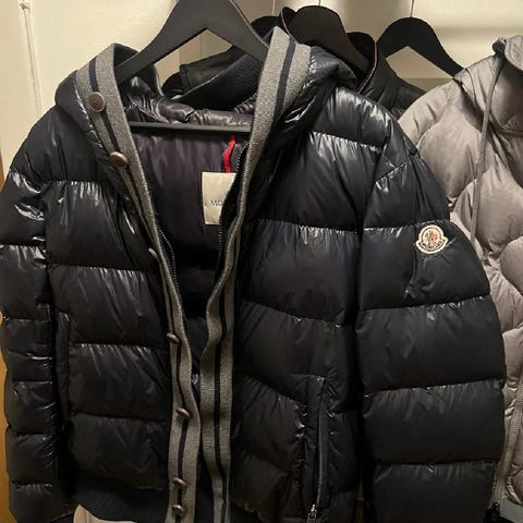 Moncler vinterjacka i storlek L (size 3) för män, brun och tillverkad av dun.