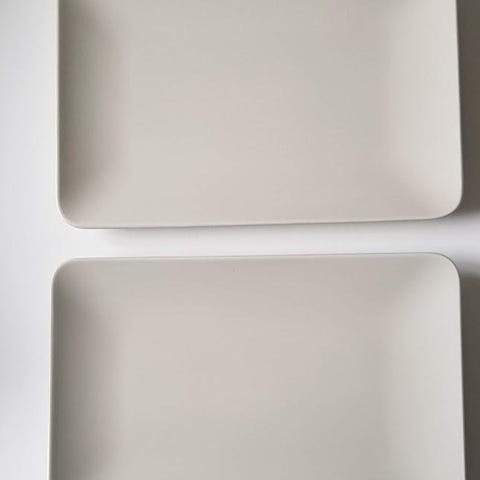 En blå bricka med handtag i plåt.