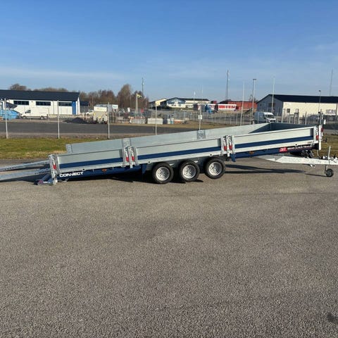 Detta lagersläp är utrustat med hydraulisk tilt, hel ramp och fällbara lämmar. Perfekt för maskintransport med snabb lastning.