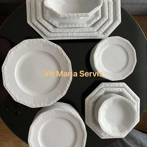 Rosenthal servisdelar och porslin i vitt med dekorativa detaljer. Inkluderar tekopp med fat, flertalet tallrikar och uppläggningsfat i olika former, samt en våningsfatställning med metallhandtag. Materialet är porslin.