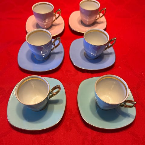 Fin kaffeservis med 12 koppar o fat+ 12 assietter, gräddkanna o sockerskål.