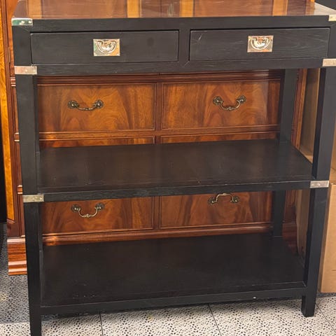 Byrån är i superfint skick, ovansidan har några små enstaka skavanker, mest under den svarta vasen till höger. Inget som stör eller syns om man ställer saker på. I annat fall kan ett lager färg på toppskivan lösa allt.