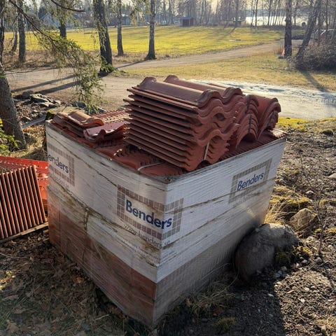 Takpannor i tegelröd färg, avsedda för takläggning. Ca 120-130 m2. Pannorna är staplade utomhus lätt och lasta.