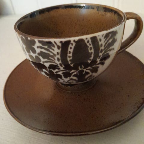 Fyra koppar (7 cm höga), fem fat (ca 15 cm i diametern), fem tallrikar (ca 17cm i diametern).