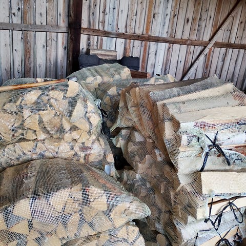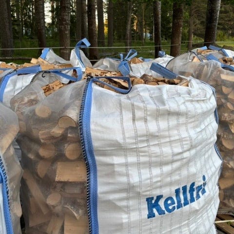 2 säckar på 1 kubik med färdighuggen björk- och fura. Storlek ca 30 cm passar bra till vedspis, kakelugn mm.