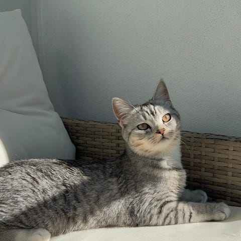 Han är en innekattoch gillar och går sällan ut på balkongen.