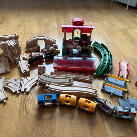 BRIO Träjärnväg och tillbehör i trä med flera spårdelar, tåg, fordon och djurfigurer. Setet innehåller böjda och raka spår, en järnvägsstation och olika tillbehör för barnlek.