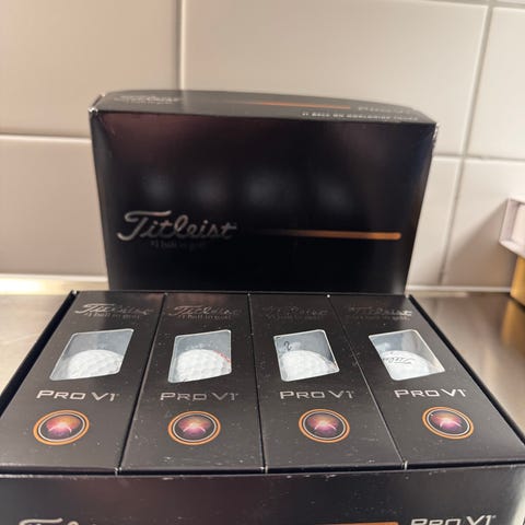 Titleist Pro V1 golfbollar i förpackning med fyra rullar. Används för golfspel och träning. Vann på tävling, legat i garderob sen dess