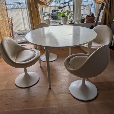 Fina stolar från Erik Magnussen och ett 140cm långt bord. (Är inte så oranget som på bilderna)