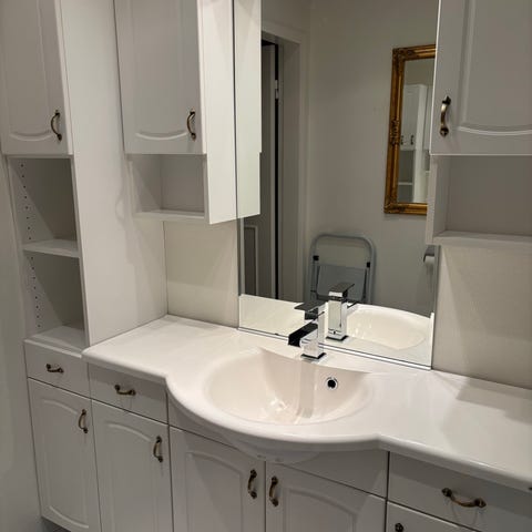 Badrumsmöbel med spegelskåp i vitt utförande.
