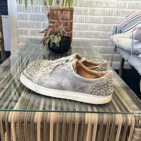 Christian Louboutin Sneakers i storlek 45. Skorna har en grå färg och är tillverkade i mocka. De är designade för vuxna och har en karakteristisk röd sula. Skorna passade helt enkelt inte min stil så har bara använt den ett par gånger