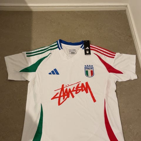 Adidas Japan fotbollströja i storlek L. Tröjan har en färggradient från mörklila till ljusrosa med tryck av ett träd och Stussy-logotyp på framsidan. Tillverkad med Aeroready-material för fukttransport.
