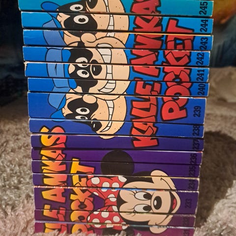 Två finska Kalla Anka pocketar: Aku Ankka ja Karhukopla & Selvät Sävelet , taskukirja 2 och 54