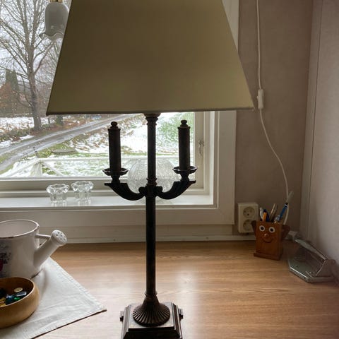 Lampan är ca 40 cm hög, har fin patina och är i gott skick. Märkt med originaletikett “Äkta mässing” och produktinfo under foten.