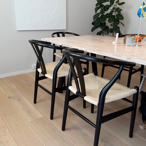 Har en del slitage på kokosrepen och dynorna. Annars en mycket rejäl och stabil stol.