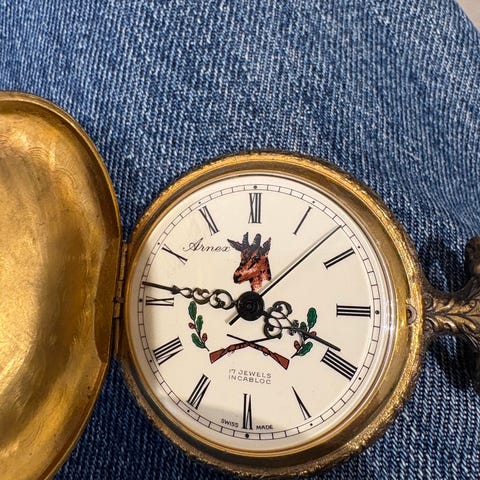 Fickur med mekaniskt urverk, romerska siffror på urtavlan och transparent mitt som visar urverkets delar. Urklockan har en silverfärgad boett med texturerad baksida. Passar för användning som tidmätare och samlarobjekt.