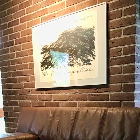 Steinberg Galerie Maeght konsttryck med abstrakt motiv i flera färger och geometriska former. Trycket är inramat och visar detaljrika element med text och symboler.