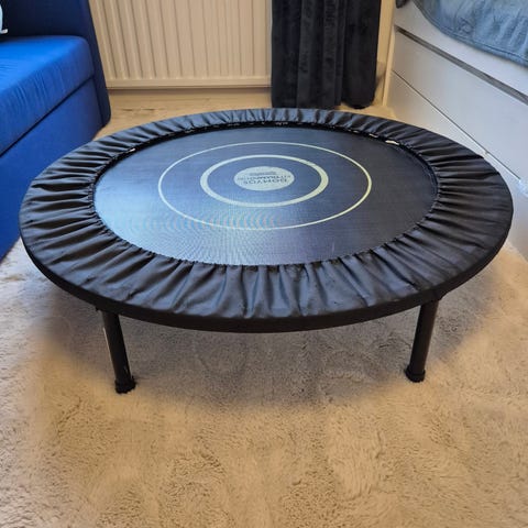 Abilica studsmatta för träning med blå kant. Studsmattan har fjädrar som ger studs och är lämplig för olika träningsövningar.